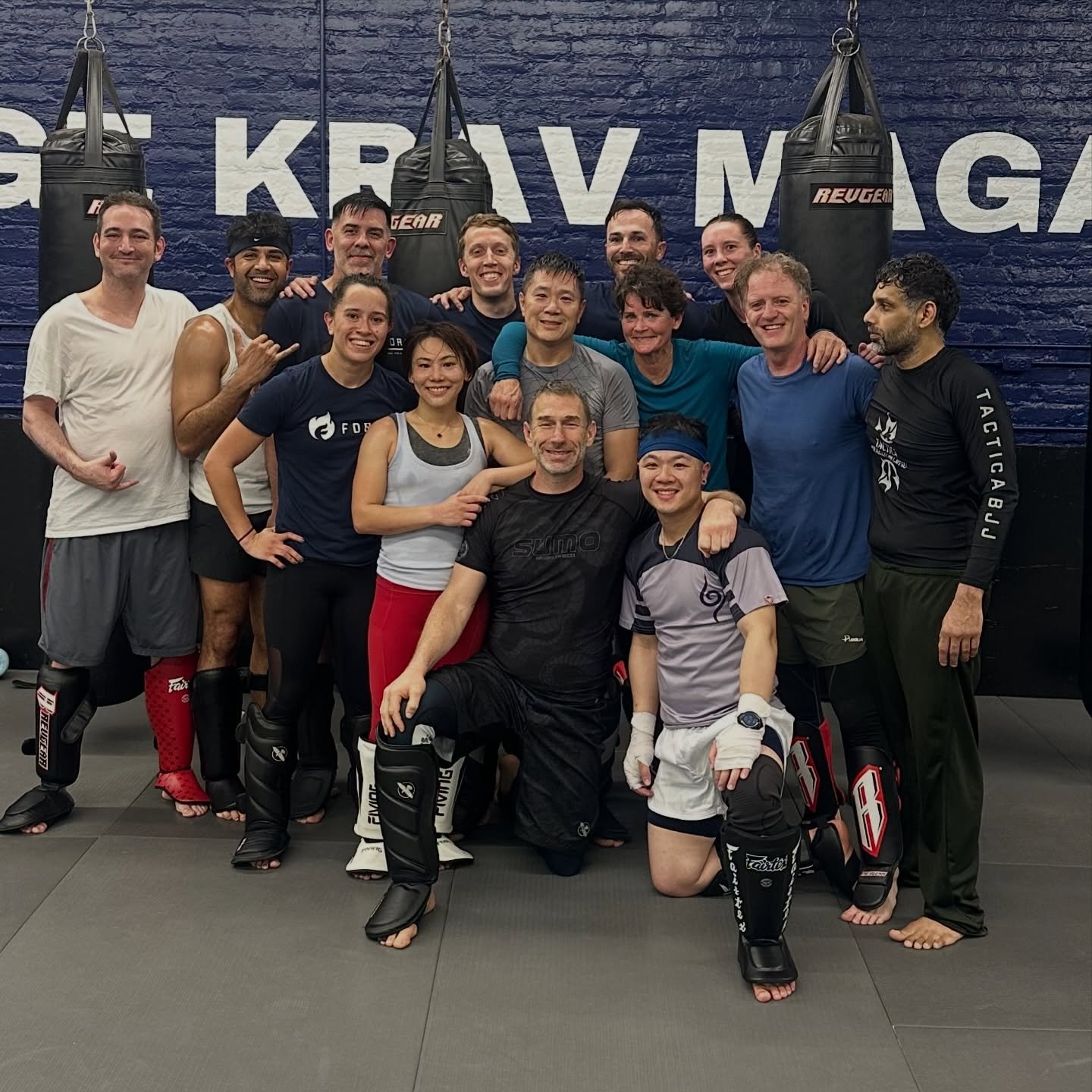 Workout clothes you can move in. Bring water. If you have gloves/shin guards, great — if not, no stress.